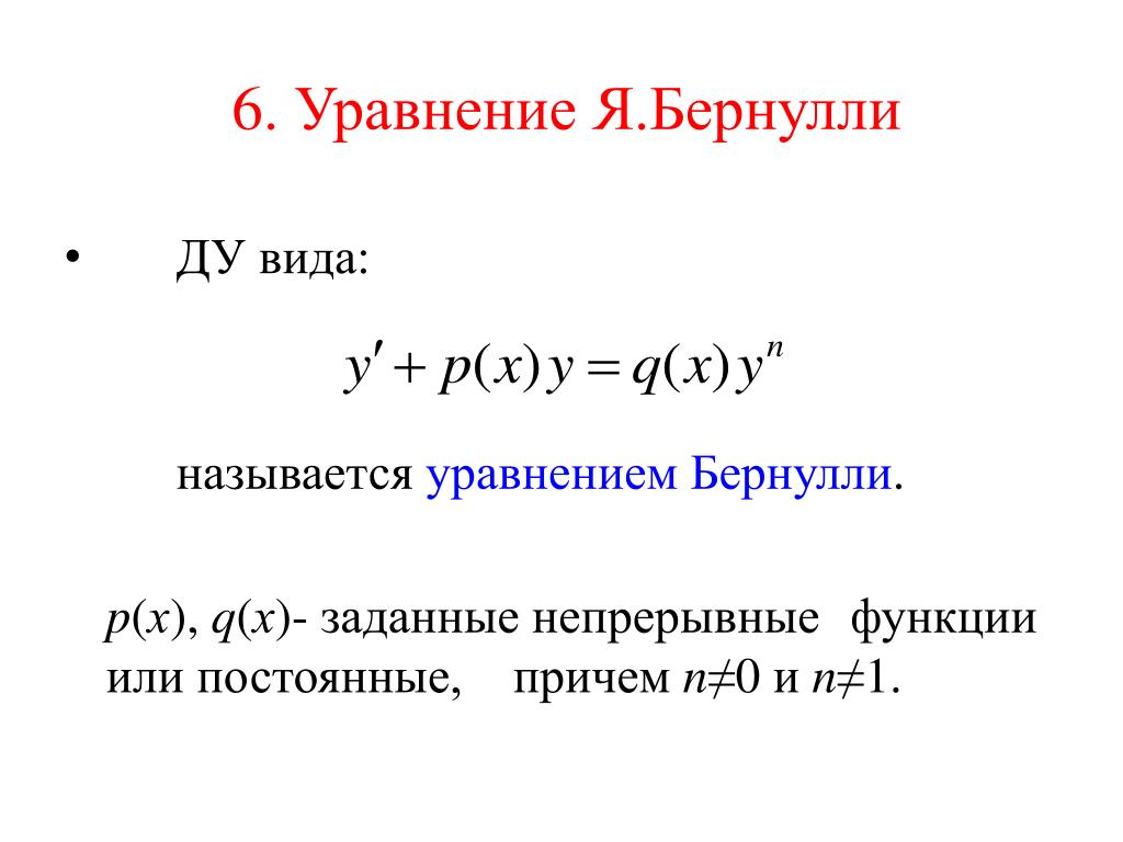 Таким образом, дифференциальное уравнение Бернулли обязательно содержит функцию y в степени, отличной от нуля и единицы.