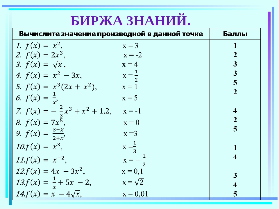 обобщение и закрепление знаний, умений и навыков вычисления производных,