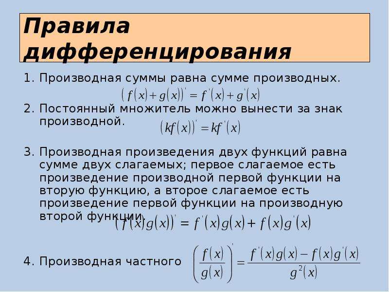 $$ \ color {синий} {(f (x) \ pm g (x)) ‘= f’ (x) \ pm g ‘(x)} $$2. Правило о сумме