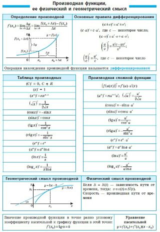 Геометрический смысл: производная от функции в точке равна тангенсу угла между осью OX и касательной к графику функции в данной точке.