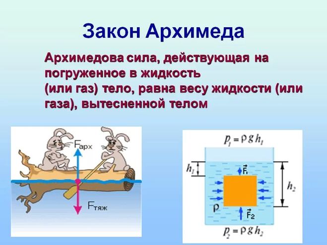 Закон Архимеда гласит, что когда тело частично или полностью погружено в жидкость, на него действует направленная вверх сила, равная весу вытесненной жидкости.