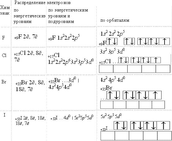 Строение внешнего электронного слоя атомов хлора, брома, иода rts p . Для всех рассматриваемых элементов возможен переход атомов в возбужденные состояния, отвечающие w > 0 этим они отличаются от фтора. Если для F единственной ненулевой степенью окисления является —1, то для остальных галогенов она лишь наиболее устойчивая.