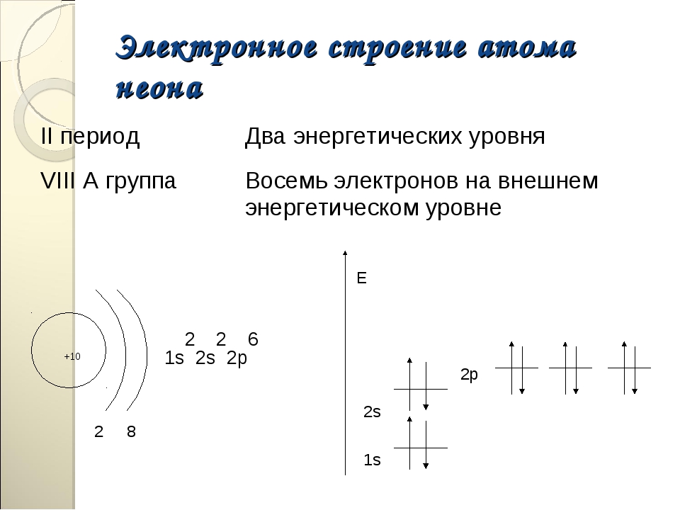 Неон (\ (\ text {Ne} \)) имеет атомный номер 10, что означает, что нейтральный атом также имеет 10 электронов. В первые 2 электрона находятся на первом энергетическом уровне, а последние 8 – на втором энергетическом уровне.(Рисунок 4.9).