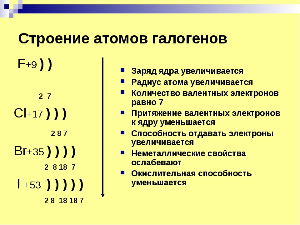 Галогены — фтор, хлор, бром, нод — расположены в главной подгруппе седьмой группы периодической системы элементов. В атомах галогенов на внешнем энергетическом уровне находится по семь электронов и они могут присоединять один электрон, превращаясь в отрицательные ионы 1 . Отрицательную степень окисления галогены имеют в соединениях с водородом и металлами. Однако атомы галогенов, кроме фтора, могут проявлять и положительные степени окисления +1, +3, +5, +7. Это объясняется электронным строением атомов. Атом фтора имеет следующее электронное строениеЭлементы фтор F, хлор С1, бром Вг, иод I и астат At составляют V1IA группу Периодической системы Д.