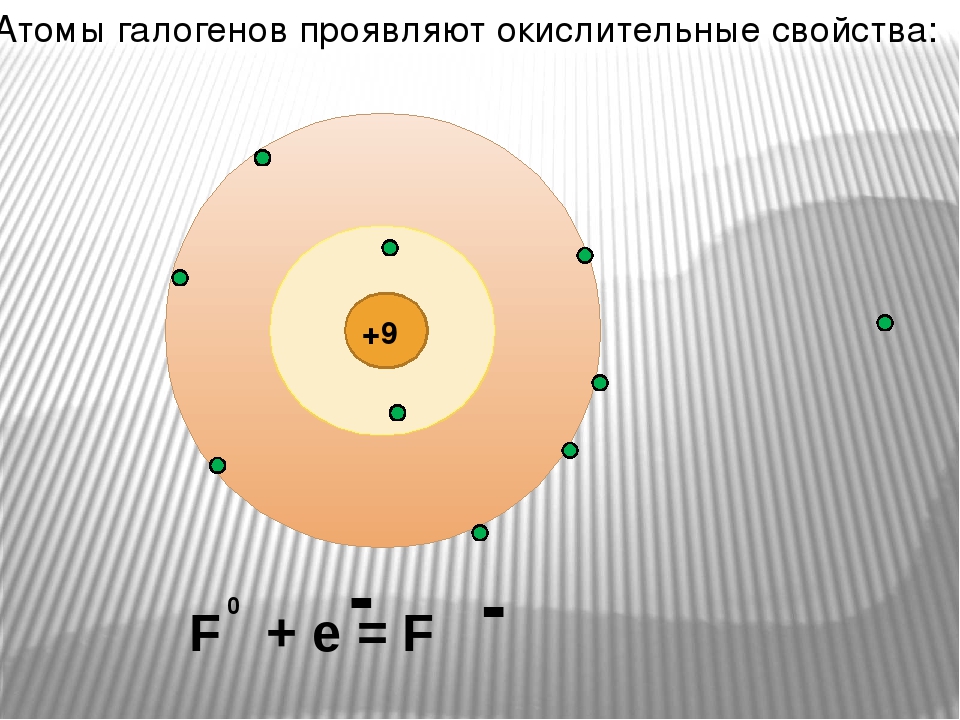 Электронная конфигурация валентного энергетического уровня атомов фтора и хлора может быть представлена формулой ns2np5, т.е на внешнем валентном слое их атомы содержат по семь электронов и, присоединяя недостающий восьмой электрон, превращаются в однозарядные анионы F– и Cl–, которые имеют устойчивую электронную конфигурацию благородного газа аргона.