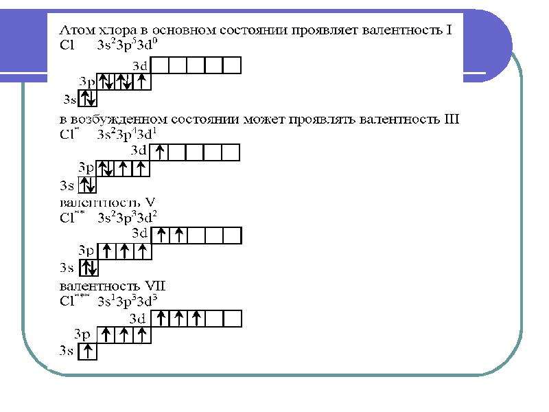 Строение внешнего. электронного слог атомов хлора, брВнешние электронные оболочки атомов хлора, брома и иода имеют свободные (/-орбитали, поэтому для всех рассматриваемых элементов возможен переход атомов в возбужденные состояния, отвечающие степеням окисления >0 этим они отличаются от фтора.