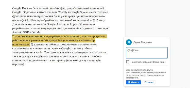 Электронное письмо можно писать в основном текстовом поле документа, там же можно упоминать адресатов через @. Когда письмо будет готово, кликните на синий значок электронной почты слева.