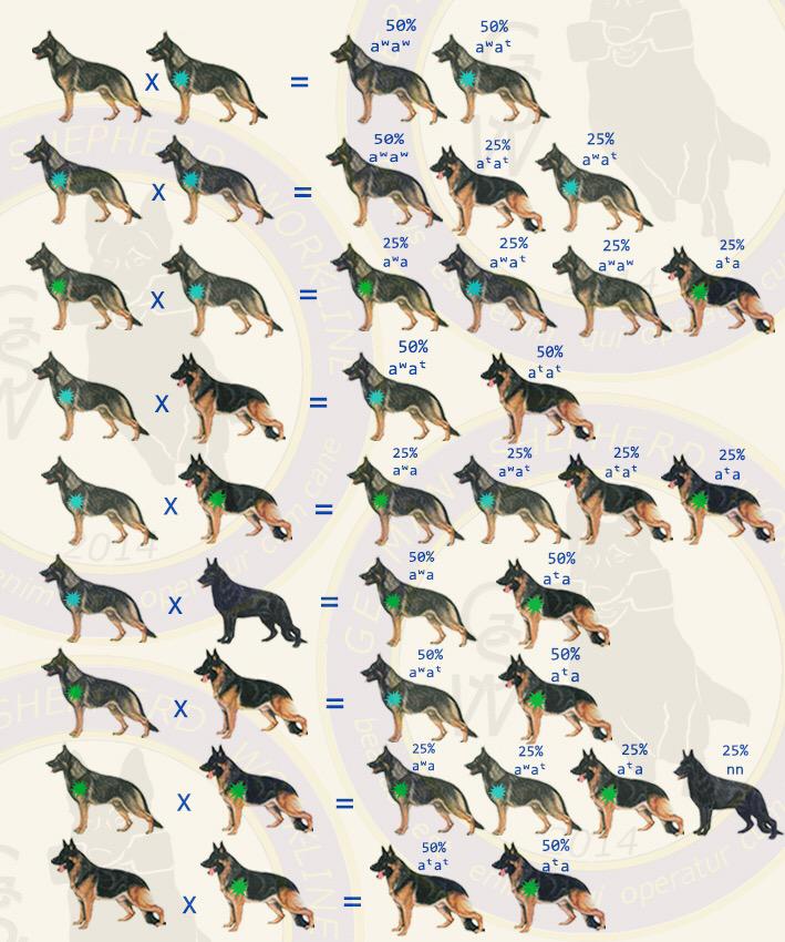 Интересно, что у большинства чистокровных пород собак, за исключением эскимосских и скандинавских, аллель дикого типа А отсутствует. Такое отсутствие столь характерно, что кажется преднамеренным. Возможно, что древние селекционеры стремились закреплять такие цветовые вариации, которые, во-первых, отличали бы домашних собак от диких форм и, во-вторых, служили бы символом одомашнивания собак.