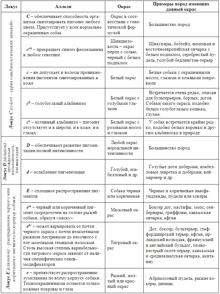 Сегодняшние ученые и заводчики знакомы с участками хромосом или локусами, ответственными за соответствующий цвет шерсти собаки, который, в свою очередь, зависит от происхождения собаки.Каждая собака имеет по два аллеля для каждого локуса. Два аллеля в одном локусе могут быть одинаковыми, и в этом случае собака гомозиготна по этому конкретному гену. И наоборот, аллели могут различаться, и в этих случаях собака гетерозиготна; из двух аллелей будет выражен доминантный. Разные локусы по-разному влияют на родственные пигменты.