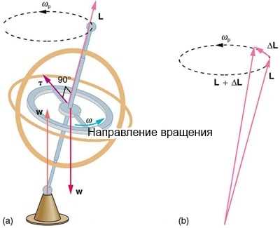 В (а) вы видите, что силами на вращающемся гироскопе выступают его вес и опорная сила от стойки. Они создают горизонтальный вращательный момент, который вносит изменения в угловой (ΔL). На (b) ΔL и L добавляют для формирования нового момента импульса с одной величиной, но в ином направлении. Поэтому гироскоп прецессирует в указанном направлении, избавляясь от падения
