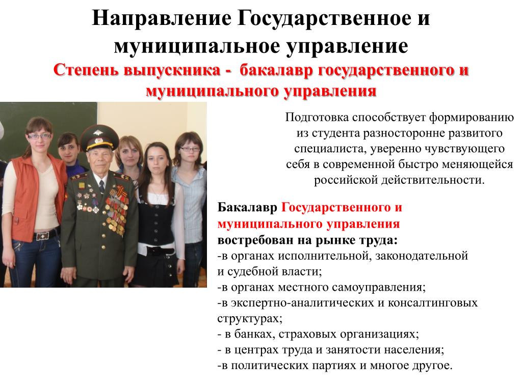 Однако есть еще одна веская причина. Выпускники, обучающиеся по специальности «Гражданское и муниципальное управление», получают комплексную подготовку в области экономики, права и управления. Иными словами, они лучше знают экономику, чем выпускники юрфаков, и лучше разбираются в юриспруденции, чем выпускники экономических факультетов.