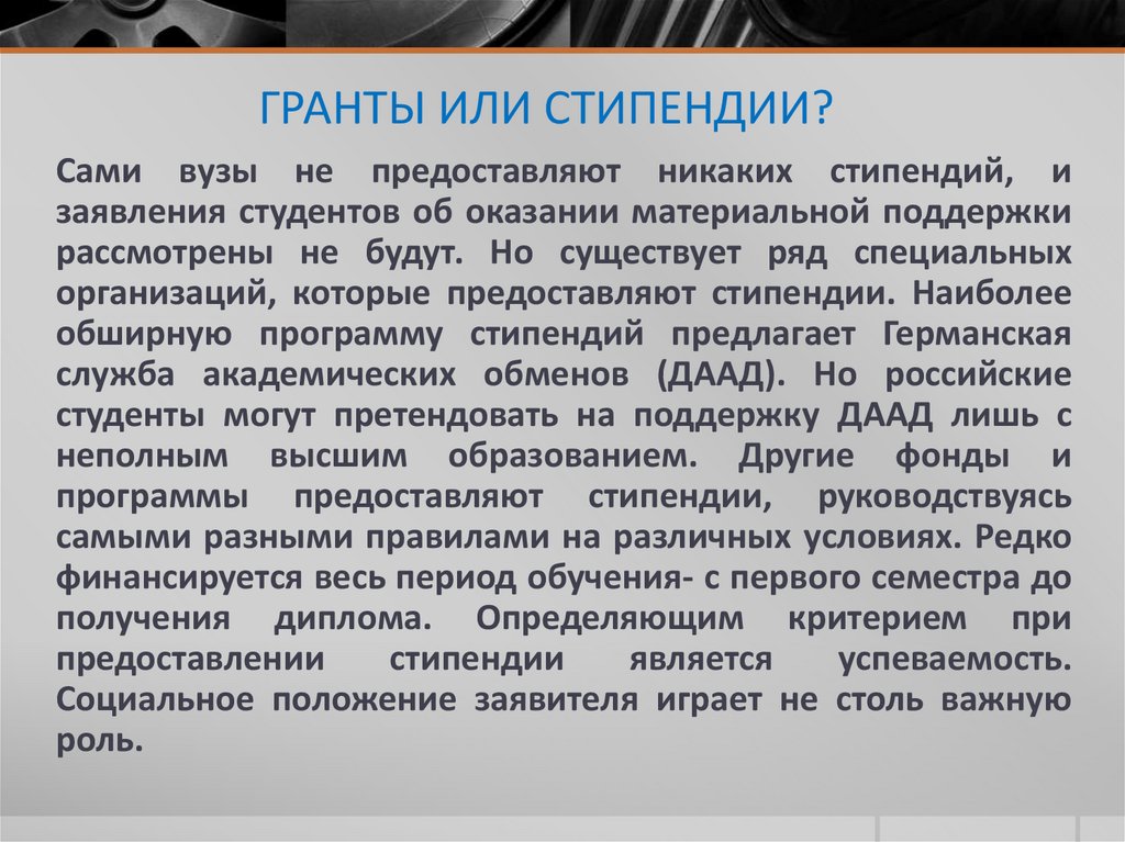 Германская служба академических обменов DAAD DAAD (Германская служба академических обменов) – самоуправляемая организация высших учебных заведений Германии. По состоянию на 2009 г. DAAD объединяет 232 немецких вузов-участников и 129 студенческих организаций и является посредником в организации внешней культурной политики, а также политики высшего образования и науки Германии. DAAD имеет 14 зарубежных представительств и 50 информационных центров по всему миру и выдает порядка 50 000 стипендий в год. Подробнее о программе на сайте: http://www.daad.ru/ |
