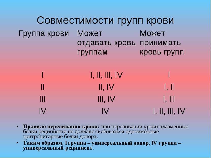 ΡΡΠΈΡΡΠΎΡΠΈΡΡ Π³ΡΡΠΏΠΏΡ 0, Π½ΠΎ Π½Π΅ ΡΠ΅Π»ΡΠ½ΡΡ ΠΊΡΠΎΠ²Ρ!, ΠΌΠΎΠΆΠ½ΠΎ ΠΏΠ΅ΡΠ΅Π»ΠΈΠ²Π°ΡΡ ΡΠ΅ΡΠΈΠΏΠΈΠ΅Π½ΡΠ°ΠΌ Ρ Π΄ΡΡΠ³ΠΈΠΌΠΈ Π³ΡΡΠΏΠΏΠ°ΠΌΠΈ ΠΊΡΠΎΠ²ΠΈ; ΡΡΠΈΡΡΠΎΡΠΈΡΡ Π³ΡΡΠΏΠΏΡ Π ΠΌΠΎΠΆΠ½ΠΎ ΠΏΠ΅ΡΠ΅Π»ΠΈΠ²Π°ΡΡ ΡΠ΅ΡΠΈΠΏΠΈΠ΅Π½ΡΠ°ΠΌ Ρ Π³ΡΡΠΏΠΏΠΎΠΉ ΠΊΡΠΎΠ²ΠΈ Π ΠΈ ΠΠ, Π° ΡΡΠΈΡΡΠΎΡΠΈΡΡ ΠΎΡ Π΄ΠΎΠ½ΠΎΡΠ° Π³ΡΡΠΏΠΏΡ Π β ΡΠ΅ΡΠΈΠΏΠΈΠ΅Π½ΡΠ°ΠΌ Π³ΡΡΠΏΠΏΡ Π ΠΈ ΠΠ.