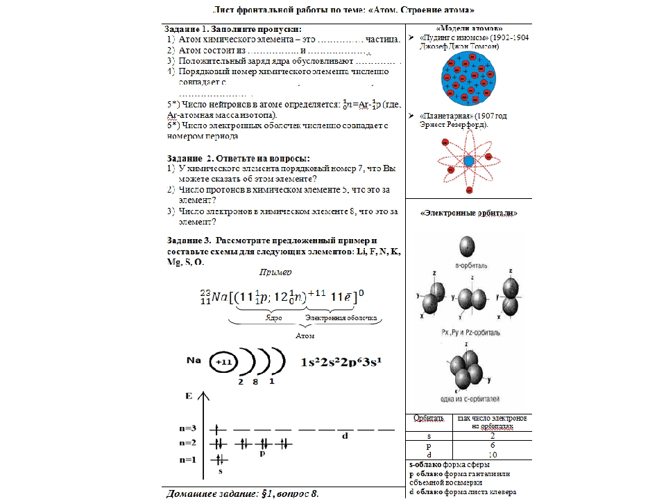 4. Сочинение. Как вы думаете, о чём идёт речь в сочинении?: “Атом мне представляется одной большой семьёй. В центре семьи, конечно же, родители: очень добрая, заботливая, положительная мама и строгий, но справедливый, словом нейтральный папа. А вокруг них вечные двигатели, вечные прыгатели – дети, которые не присядут ни на минутку. Они словно маленькие “энерджайзеры”, у них много-много дел, им хочется всё увидеть, всё услышать, всё узнать. И чем больше запас их энергии, тем дальше убегают они от родителей. Для того чтобы семья была гармоничной: чтобы дети могли получить хорошее образование, развивать свои способности в музыкальной школе, в изостудии, в танцевальных коллективах, в спортивных секциях и т.д.; чтобы папа и мама могли позволить себе посещать театры, концерты, путешествовать и прочие радости жизни, родители очень много трудятся. Папа выполняет нейтральные дела, а мама – только положительные, за каждое дело они получают единицу зарплаты. Поэтому общая зарплата папы и мамы составляет доход всей семьи.