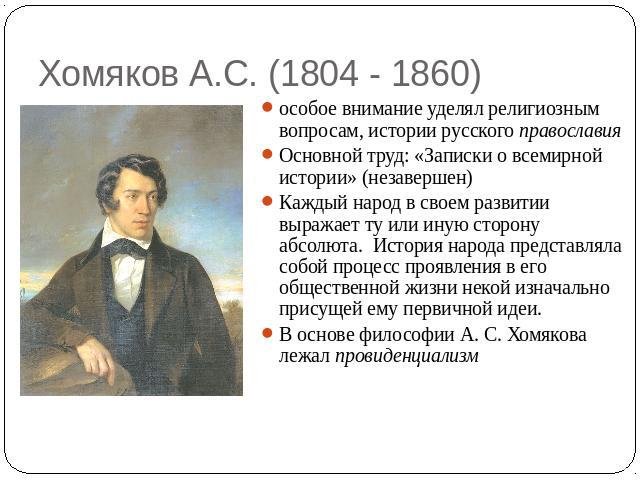 Алексей Степанович Хомяков (1804–1860) – выдающийся русский философ, богослов, поэт, художник, публицист, изобретатель, один из основоположников славянофильства.