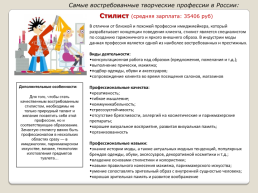 • Творчество — это по-настоящему необъятная группа специальностей. Девушка в наши дни смело может заниматься режиссурой, организацией праздников, живописью, реставрацией мебели, планировкой интерьеров, вокальным искусством и многим-многим другим. Кроме того, благодаря активному развитию IT-технологий выпускницы 11 классов вполне могут податься в веб-дизайн или в компьютерное иллюстрирование.
