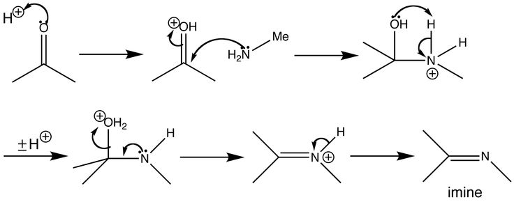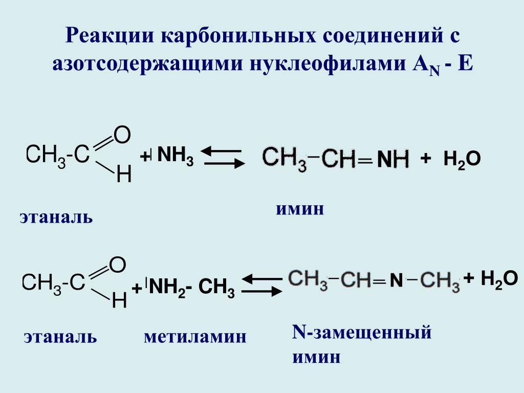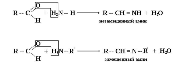 При реакции самого аммиака с карбонильными соединениями образуются неустойчивые и склонные к полимеризации имины. Имины, содержащие хотя бы один ароматический заместитель у карбонильного углерода (Аr–СН=N–R), являются устойчивыми продуктами. Они известны как основания Шиффа (часть 2, глава 2).