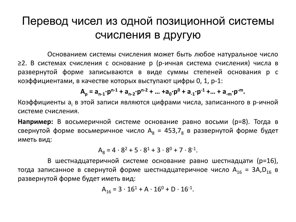 Переводы из других систем счисления в десятичную происходят по аналогии с вышеописанными способами.