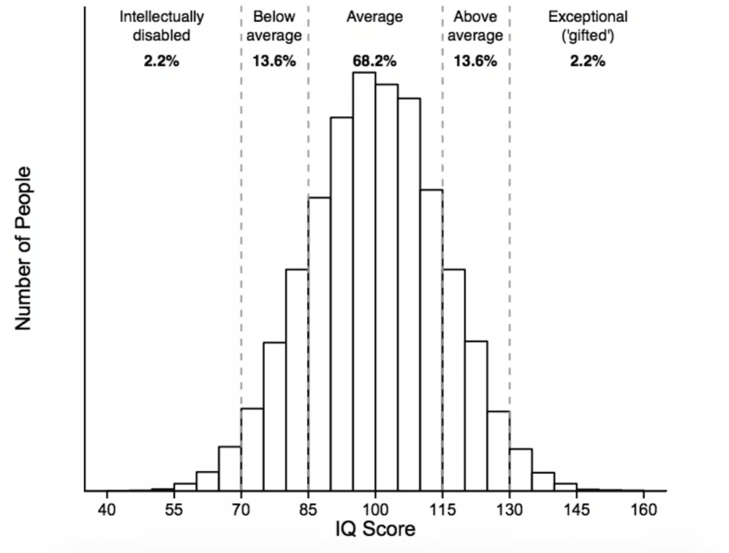 68 % результатов IQ-тестирования попадает в пределы стандартного отклонения от среднего значения. Это значит, что у большинства людей IQ находится между 85 и 115.
