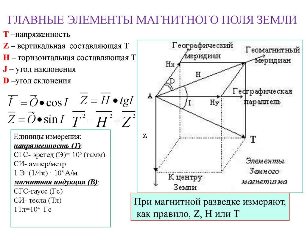 При геологической разведке измеряют абсолютные (Т) и относительные по отношению к какой-нибудь исходной (опорной) точке (ΔT, ΔZ) элементы магнитного поля.