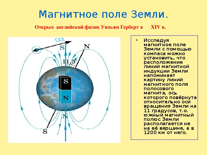 В общих чертах картина магнитного поля Земли выглядит так, будто внутри неё есть огромный (по некоторым оценкам около 2000 км длиной) линейный магнит. Ось этого магнита наклонена под углом 11,5° к оси вращения Земли, поэтому координаты северного магнитного полюса – 79°с.ш. и 71°з.д., а южного – 75°ю.ш. и 120°в.д. (см. примечание 1). При этом центр магнита отстоит от центра Земли на расстояние около 400 км.