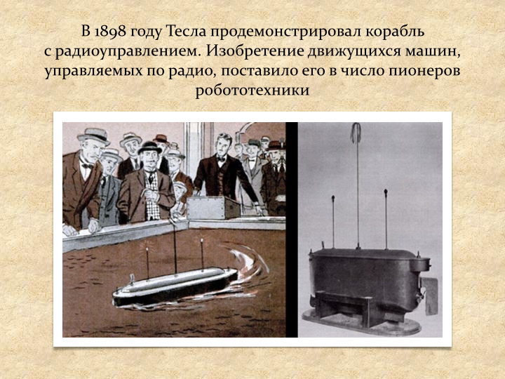 Используя радиосигналы , Тесла смог дистанционно управлять двигателем, аксессуарами и системой освещения игрушечной лодки. Сегодня дронов основаны на этой технологии .