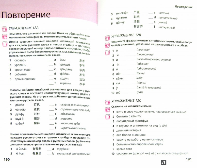 Но не следует возлагать слишком большие надежды только на метод: при отсутствии усилий с вашей стороны никакой метод не поможет. Кроме того, новизна любого методического подхода, с нашей точки зрения, относительна: эффективное изучение иностранного языка, во многом, базируется на сочетании новых и старых, проверенных временем методов, таких, например, как выучивание текстов и диалогов наизусть, прописывание иероглифики, регулярное выполнение упражнений и т.д. Другими словами, новая методика не избавит вас от систематических занятий языком. Кстати, многие старые учебники китайского языка, систематично излагающие основы грамматики и иероглифики (для примера назовем «Основы китайского языка» Т.П. Задоенко и Хуан Шуин и «Разговорный китайский язык» Тань Аошуан) до сих пор не без основания считаются одними из лучших.