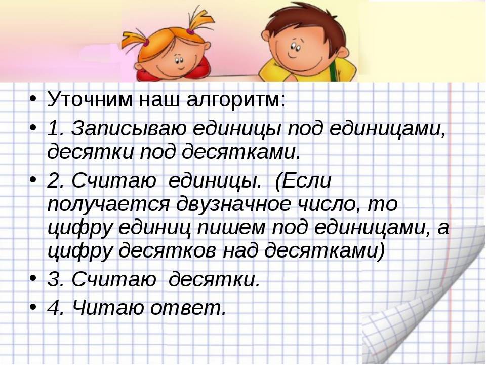 Надеюсь, все помнят этот способ сложения? 🙂 Складываем по-очереди все разряды, начиная с единиц. Но это на листочке.