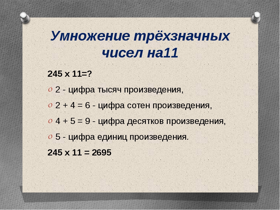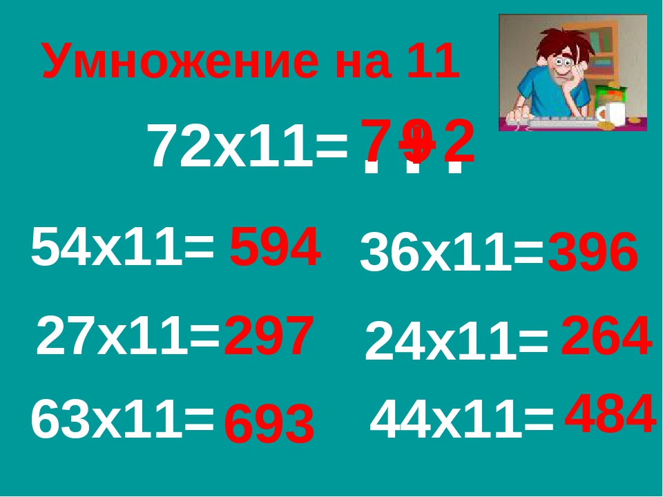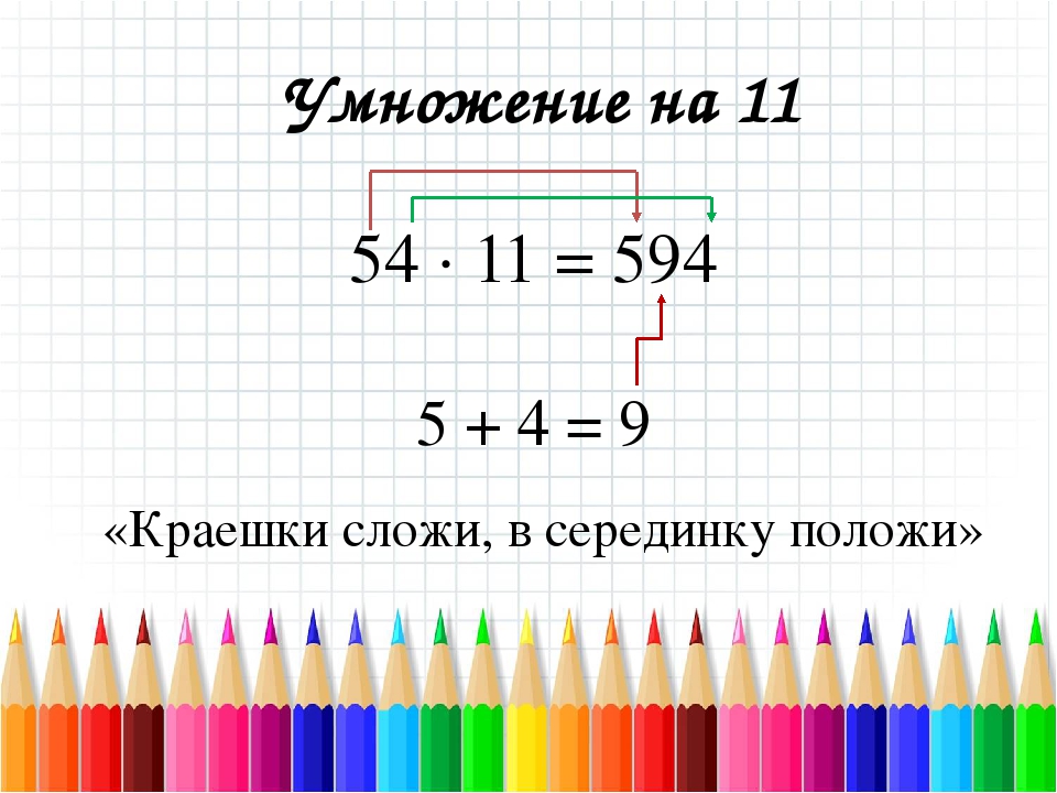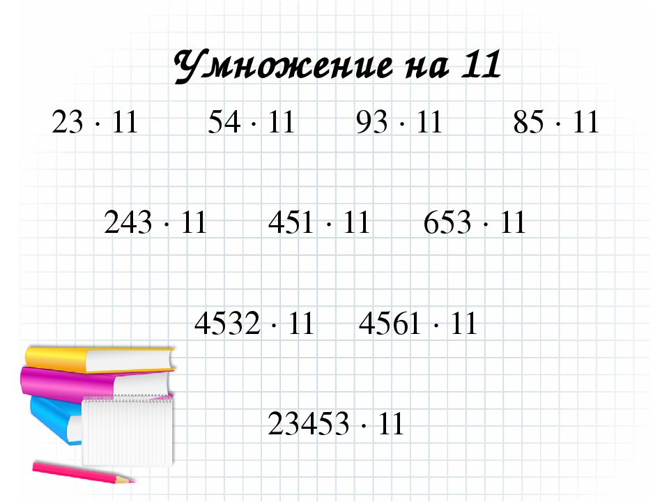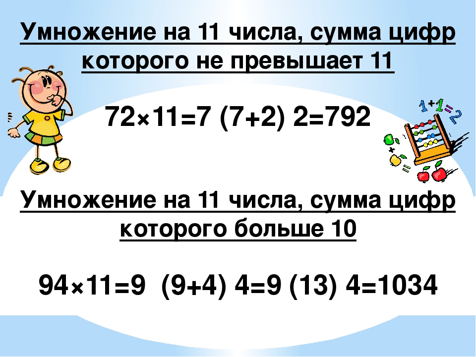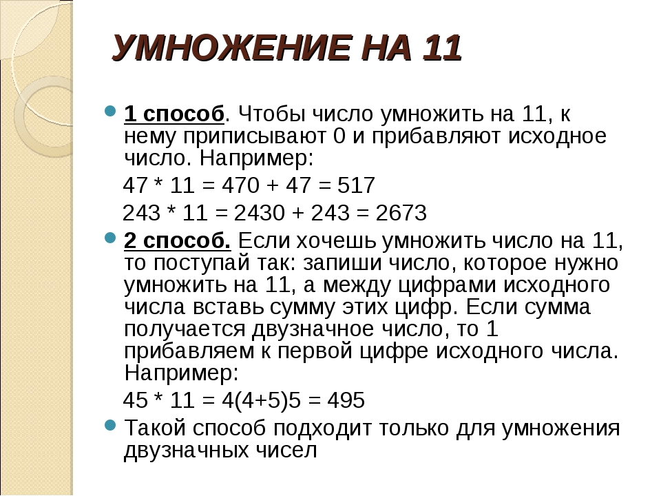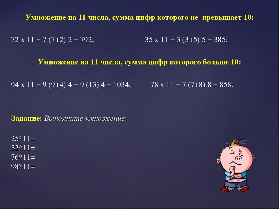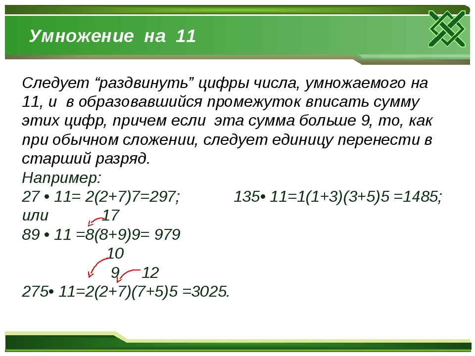 Следует “раздвинуть” цифры числа, умножаемого на 11, и в образовавшийся промежуток вписать сумму этих цифр, причем если эта сумма больше 9, то, как при обычном сложении, следует единицу перенести в старший разряд.