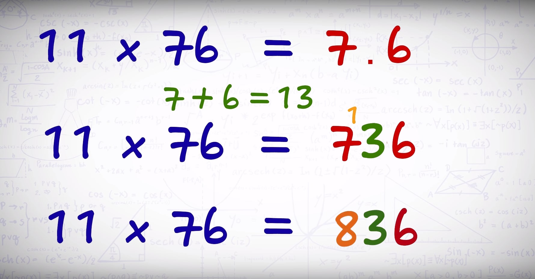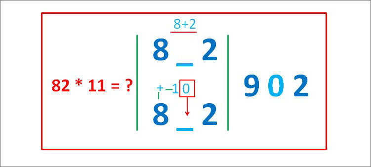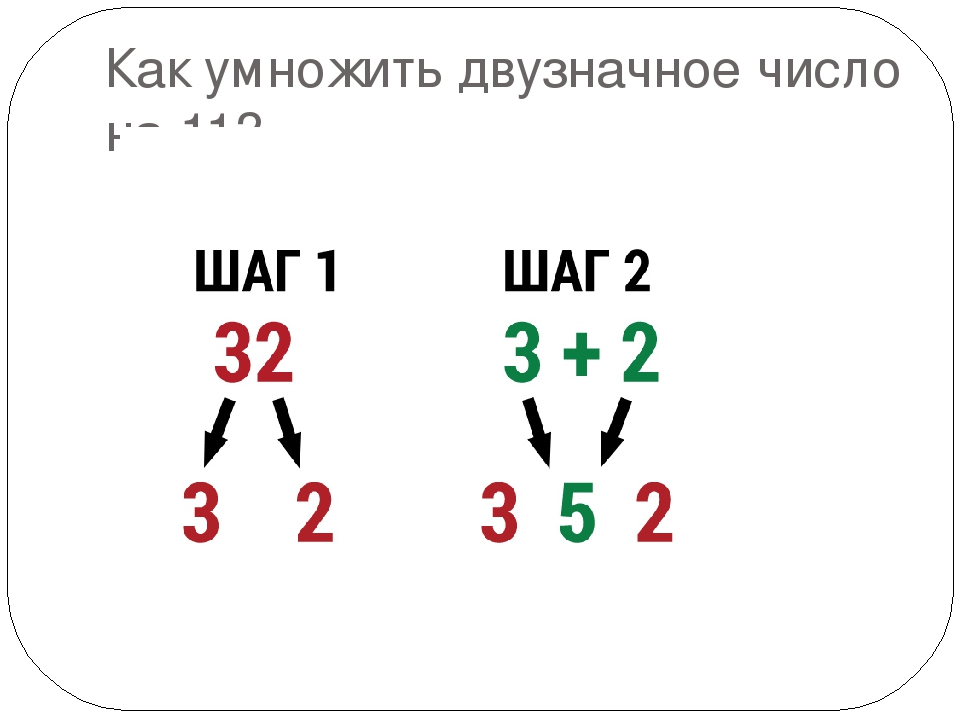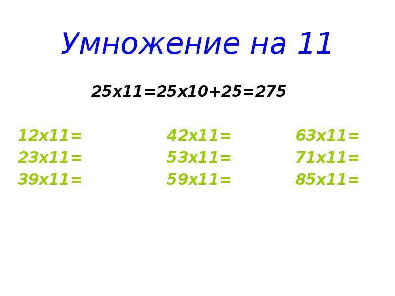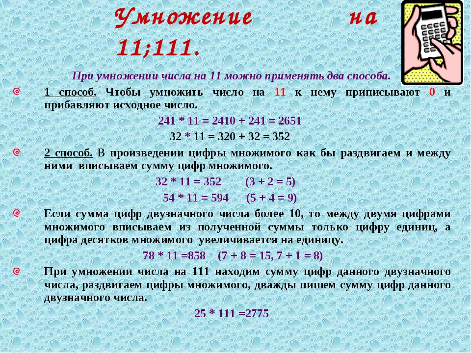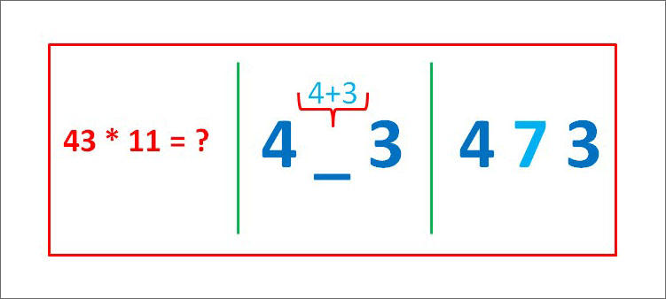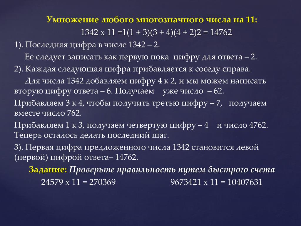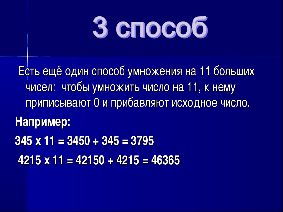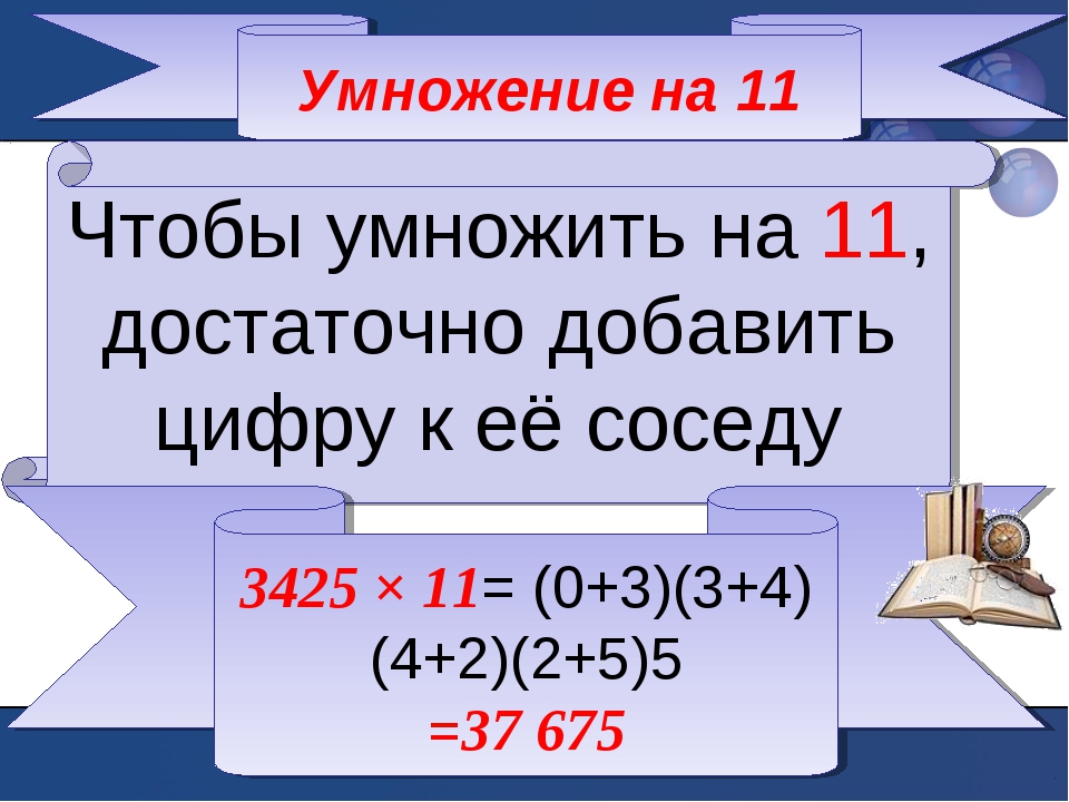Следует “раздвинуть” цифры числа, умножаемого на 11, и в образовавшийся промежуток вписать сумму этих цифр, причем если эта сумма больше 9, то, как при обычном сложении, следует единицу перенести в старший разряд.