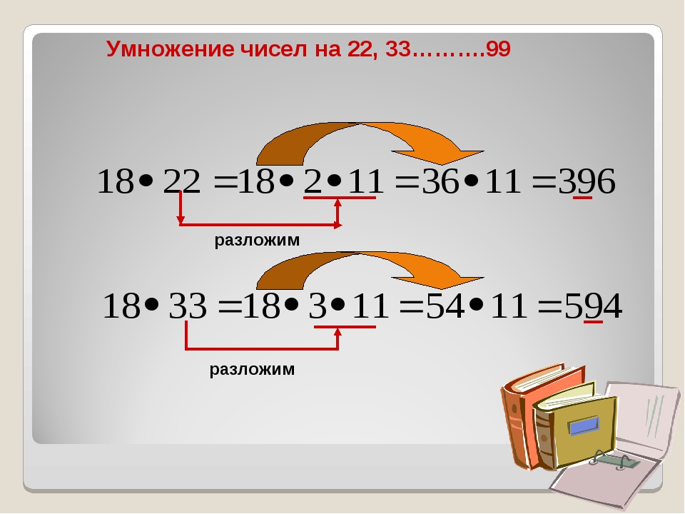 Чтобы двузначное число умножить 22,33, …,99, надо этот множитель представить в виде произведения однозначного числа на 11. Выполнить умножение сначала на однозначное число, а потом на 11: