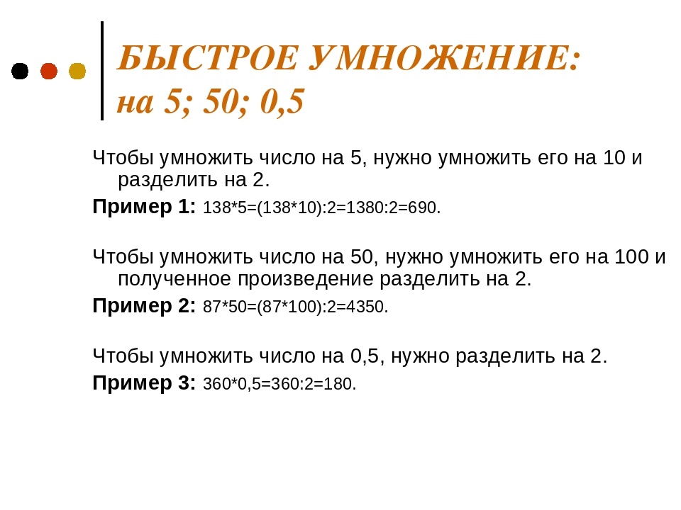 Умножение на 5, 50, 500 и т. д. заменяется умножением на 10, 100,1000 и т. д. с последующим делением на 2 полученного произведения (или делением на 2 и умножением на 10, 100, 1000 и т. д.). (50 = 100: 2 и т.д.)