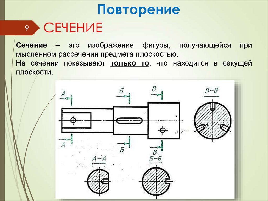 Разрез – это вид, который никогда не увидишь в реальной жизни, так как это вид на комнату или здание, если часть его была вырезана.Место, где вырезается здание, называется «секущей плоскостью», а положение воображаемой секущей плоскости обычно обозначается линией секущей плоскости, которая состоит из длинных черточек, разделенных двумя более короткими.