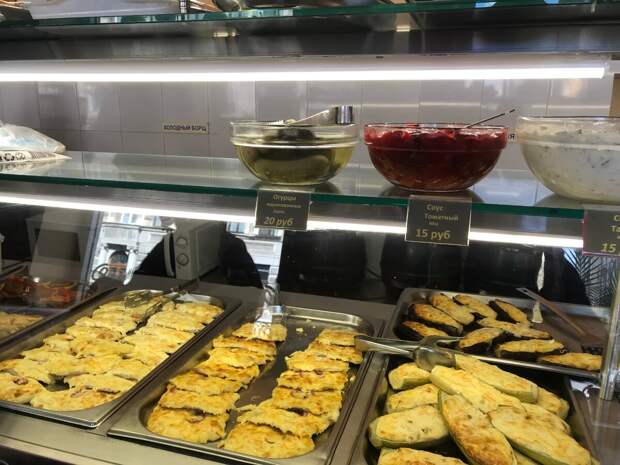 Столовая находится на первом этаже бизнес-центра «Пулково» и работает круглосуточно. В ней подают ту же еду, что и в обычных столовых: куриный суп, борщ, макароны, гречку, мясо, рыбу, салаты, выпечку.
