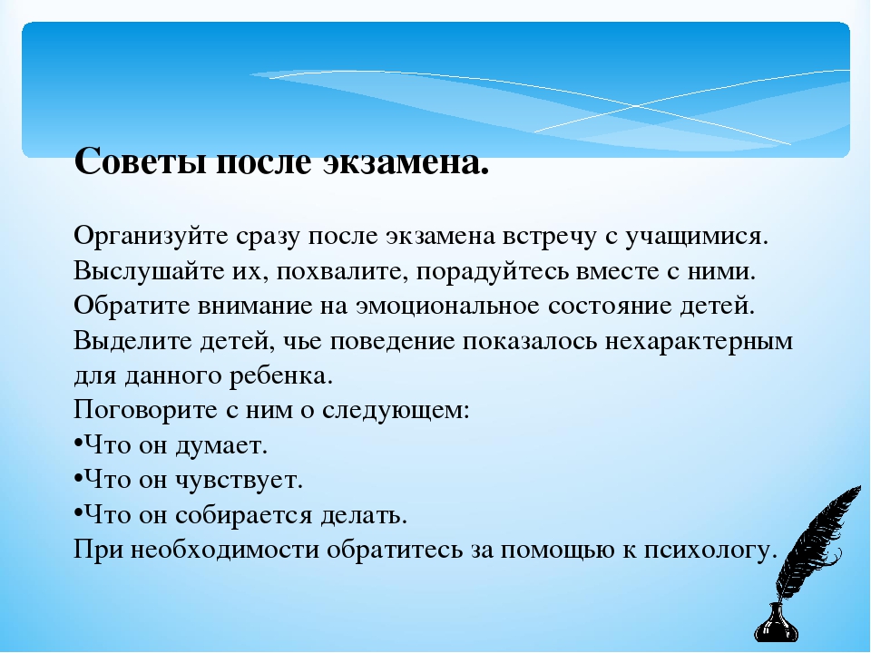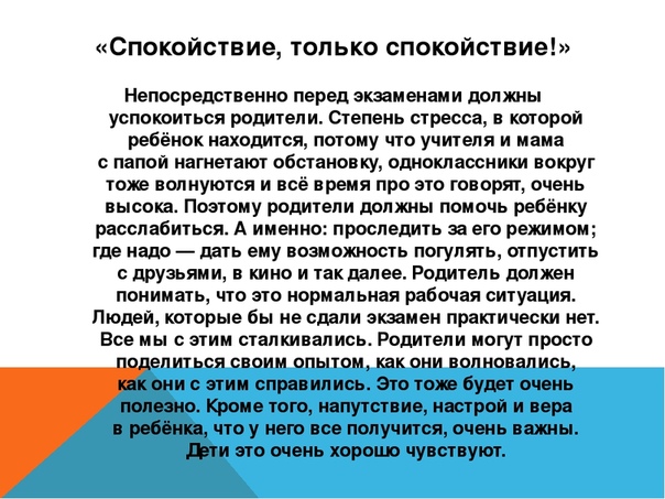 Если вы вдруг занервничали, отложите ручку и экзаменационные материалы в сторону и спокойно подышите , помедитируйте. Достаточно всего 2–4 минут. Закройте глаза и медленно вдыхайте, считая от 1 до 4–6, а затем выдыхайте, повторяя счёт. Сконцентрируйтесь, чтобы не отвлекаться на свои мысли и окружающие шумы. Дыхание поможет вам расслабиться, и вы сможете спокойно вернутся к выполнению заданий.