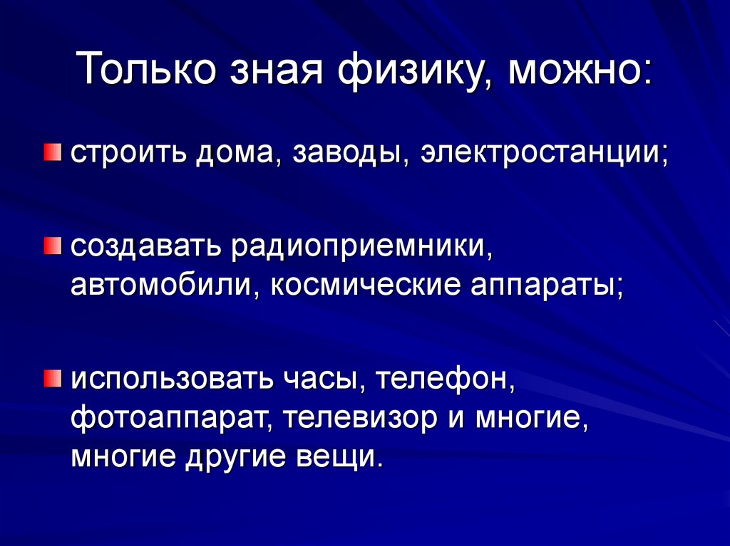 Только зная физику, можно проектировать и строить дома, заводы, машины и электростанции. Чтобы создавать радиоприёмники, автомобили, космические аппараты, даже просто одежду и продукты питания, надо знать физику.