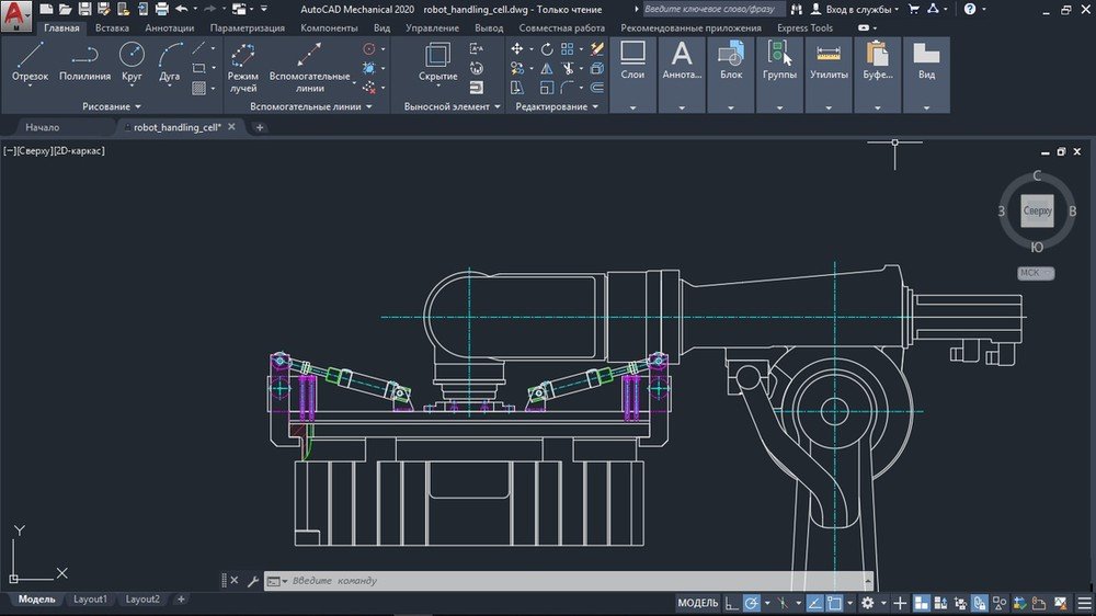 Лента разделена на две части: вкладка ленты и панели. На вкладке ленты отображаются зонтичные имена группы команд, а в разделе ленты представлена более детальная группировка команд для упрощения навигации. На главной вкладке в AutoCAD сгруппированы категории команд, такие как «Макет аннотаций изменения чертежа», «Свойство», «Утилита группировки», «Буфер обмена» и «Вид». Другие страницы включают в себя вставку аннотирующих параметриков, просмотр надстроек управления выводами. AutoCAD будет отображать другие страницы, связанные с контекстом, когда вы выбираете определенные команды.