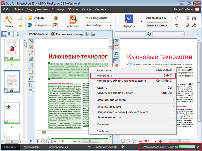 - Используйте возможности программы для распознавания целого документа или выбранной вами части.