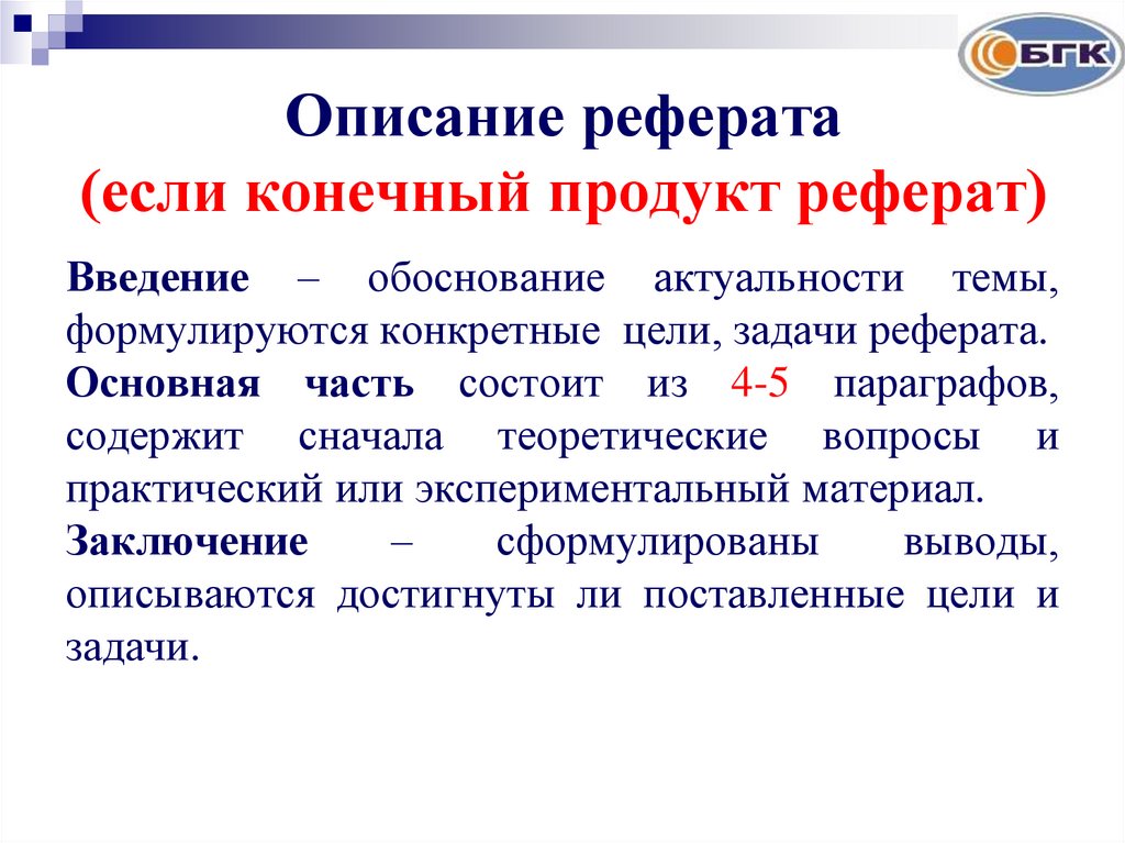 Сложнее дело обстоит с продуктивными рефератами – докладами и обзорами. Здесь, как и в любой исследовательской работе, придется заполнить ряд обязательных моментов: обозначить актуальность, предмет и объект, цель и задачи, обосновать выбор темы.