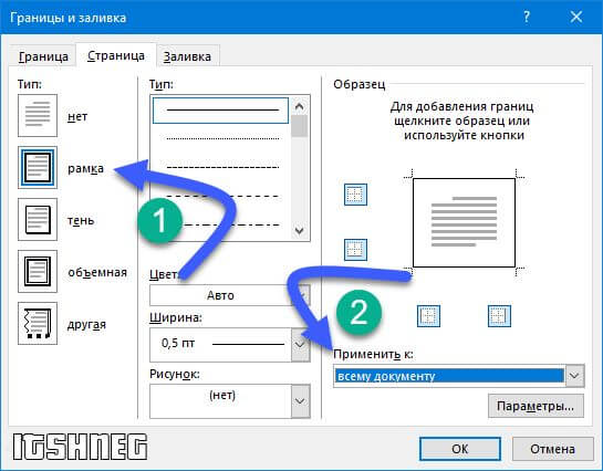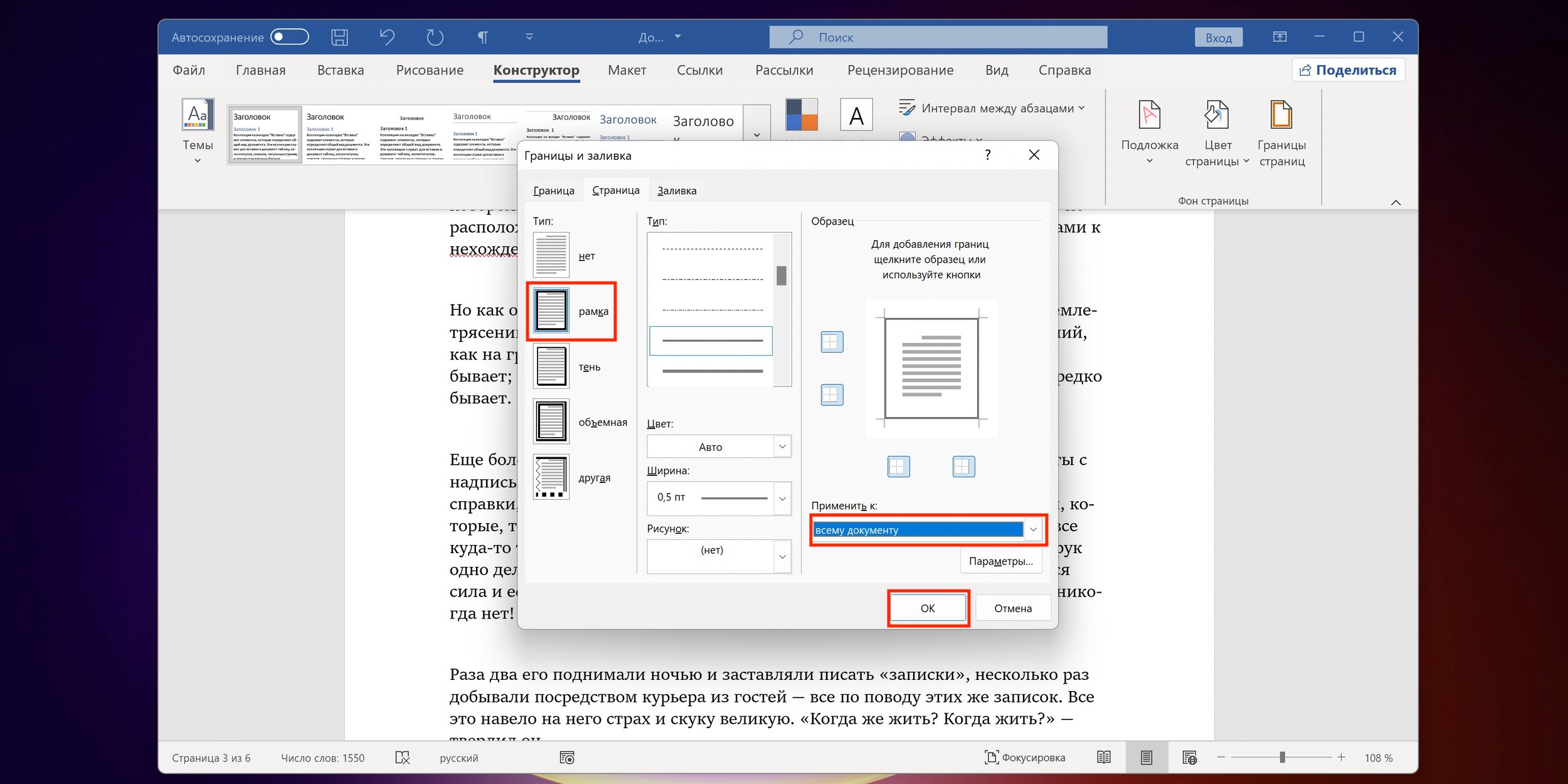 Соответственно, если нужно применить рамку на всех страницах, необходимо установить «применить к» «всему документу».