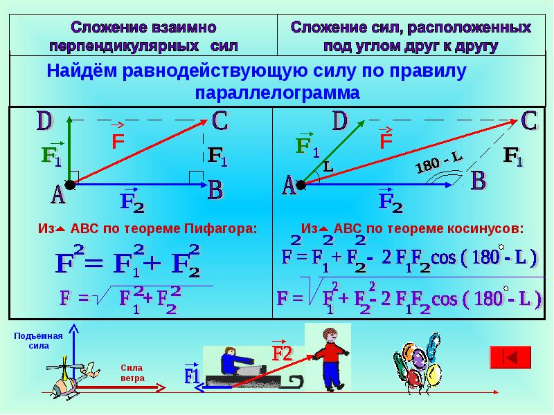 1) Действие силы и направление движения тела направлены горизонтально. Например, автомобиль едет по прямому пути, и сила тяги автомобиля приложена в том же направлении.