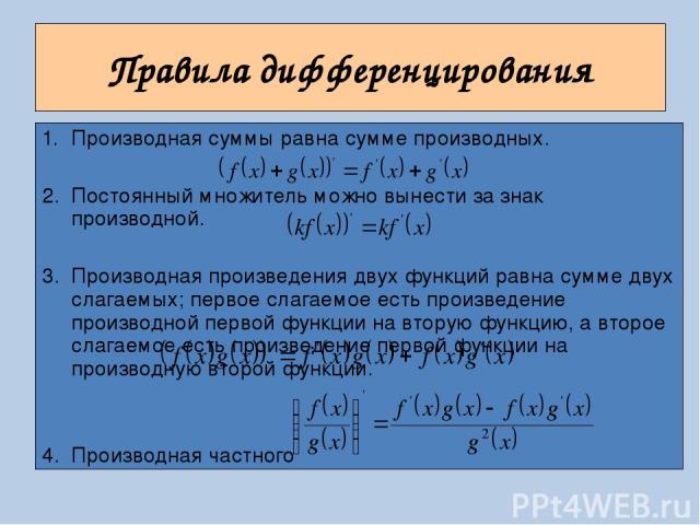 “Производная суммы или разности Это следует из теоремы 1 о пределах, урок 2. Например,