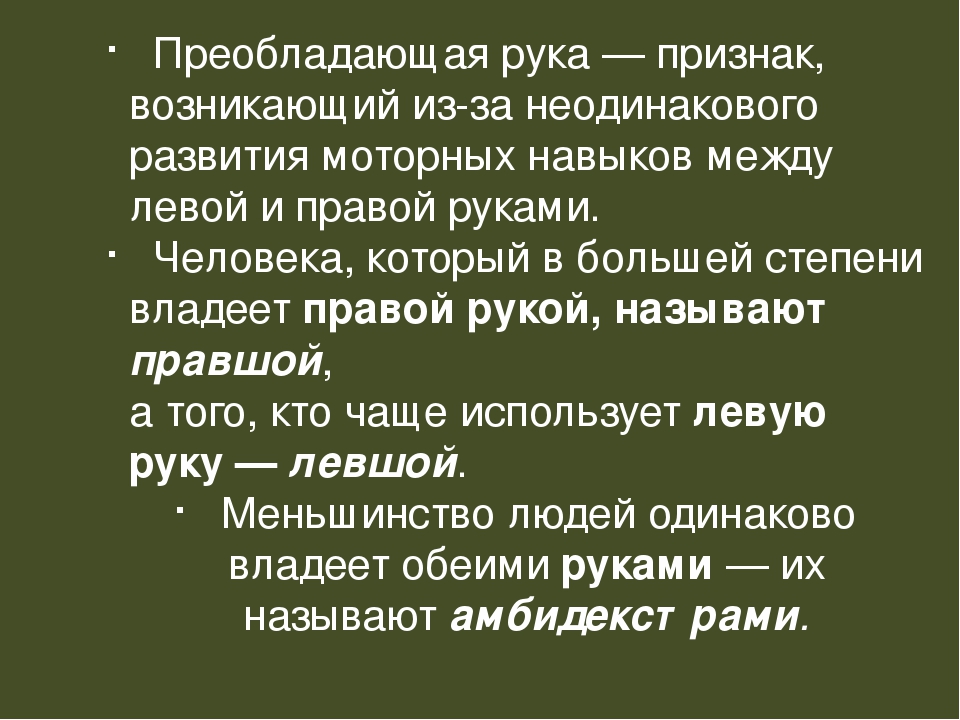 Почти у 90% людей доминантной является правая рука, у остальных — левая. И лишь около 1% населения — амбидекстры. Они одинаково хорошо выполняют все задачи обеими руками.