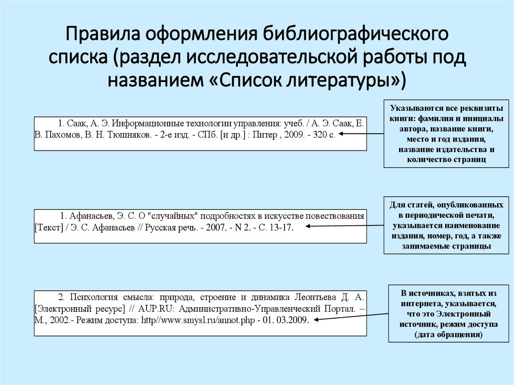 Труды ученых размещают в алфавитном порядке по первой букве фамилии автора. Отечественные работы в списке литературы размещают раньше зарубежных трудов. Электронные источники информации размещают в последнюю очередь. Список литературы должен оформляться нумерацией.
