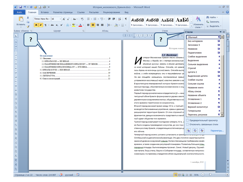 Наиболее простым и правильным является оформление содержания с помощью специально разработанных для этого средств текстового процессора Майкрософт.