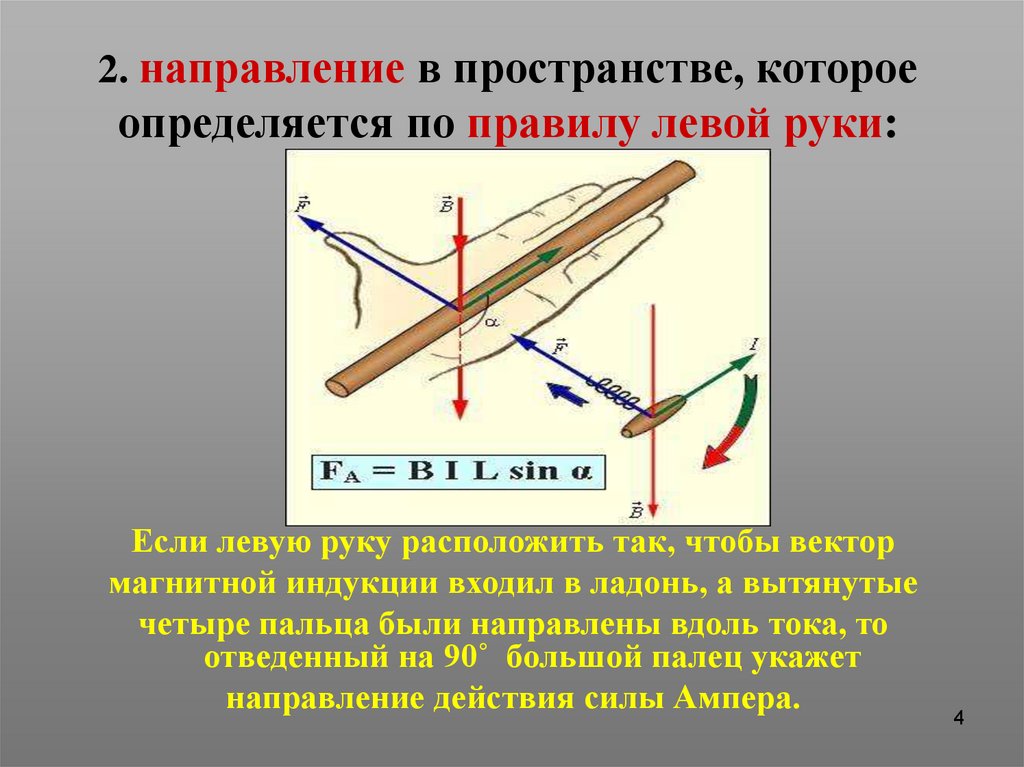 Правило левой руки. Если левую руку разместить так, чтобы линии магнитной индукции входили в ладонь, а четыре пальца показывали направление тока, то отставленный большой палец покажет направление силы, действующей на проводник с током в магнитном поле.