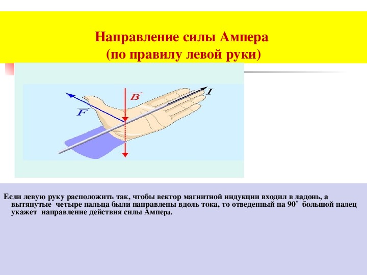 Если расположить левую руку так, чтобы магнитные линии пронизывали ладонь, а вытянутые четыре пальца указывали направление тока в проводнике, то отогнутый большой палец укажет направление движения проводника.