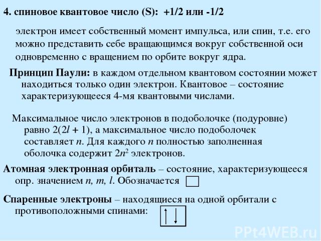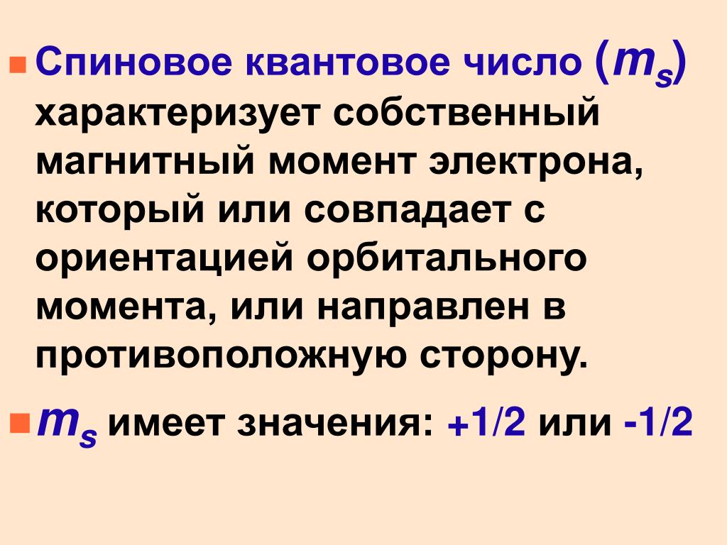 Обычно квантовое число спина обозначается s . Однако для всех электронов с = ½. Ассоциированное число m s дает возможные ориентации s таким же образом, как m l дает возможные ориентации l . Возможные значения м с 92s(s+1)