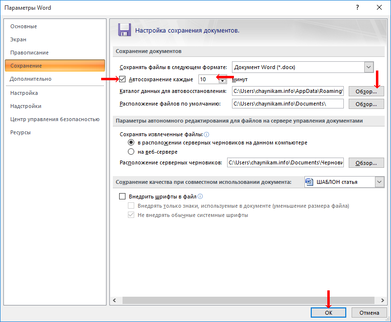 Как настроить автосохранение в Word 2016, 2013, 2010
