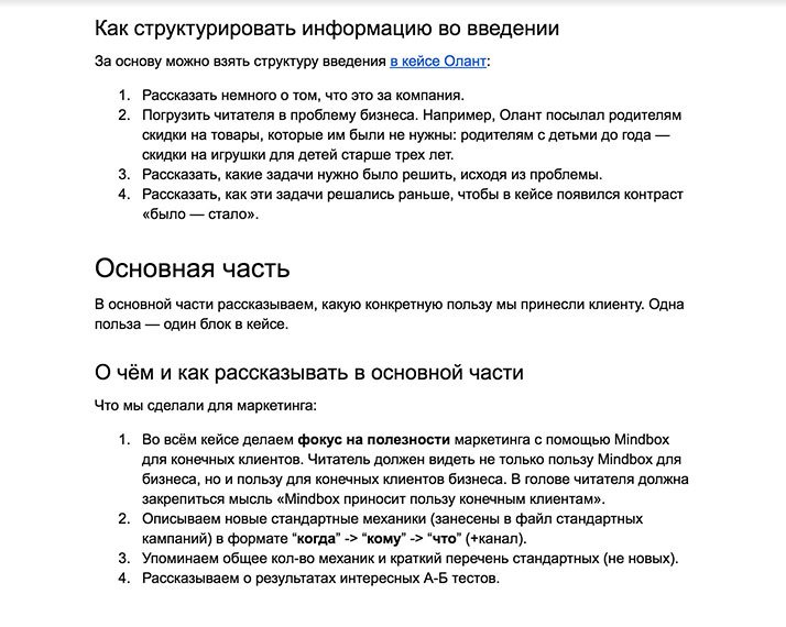 Чтобы быстро выпускать их, мы разработали шаблон, под который можно подогнать практически любой наш проект. Он помогает редакторам преодолеть страх белого листа. Кроме того, мы хотим, чтобы наши эксперты начали писали кейсы самостоятельно, а редакторы им помогали, потому что проектов много и редакторов на всех не хватает.